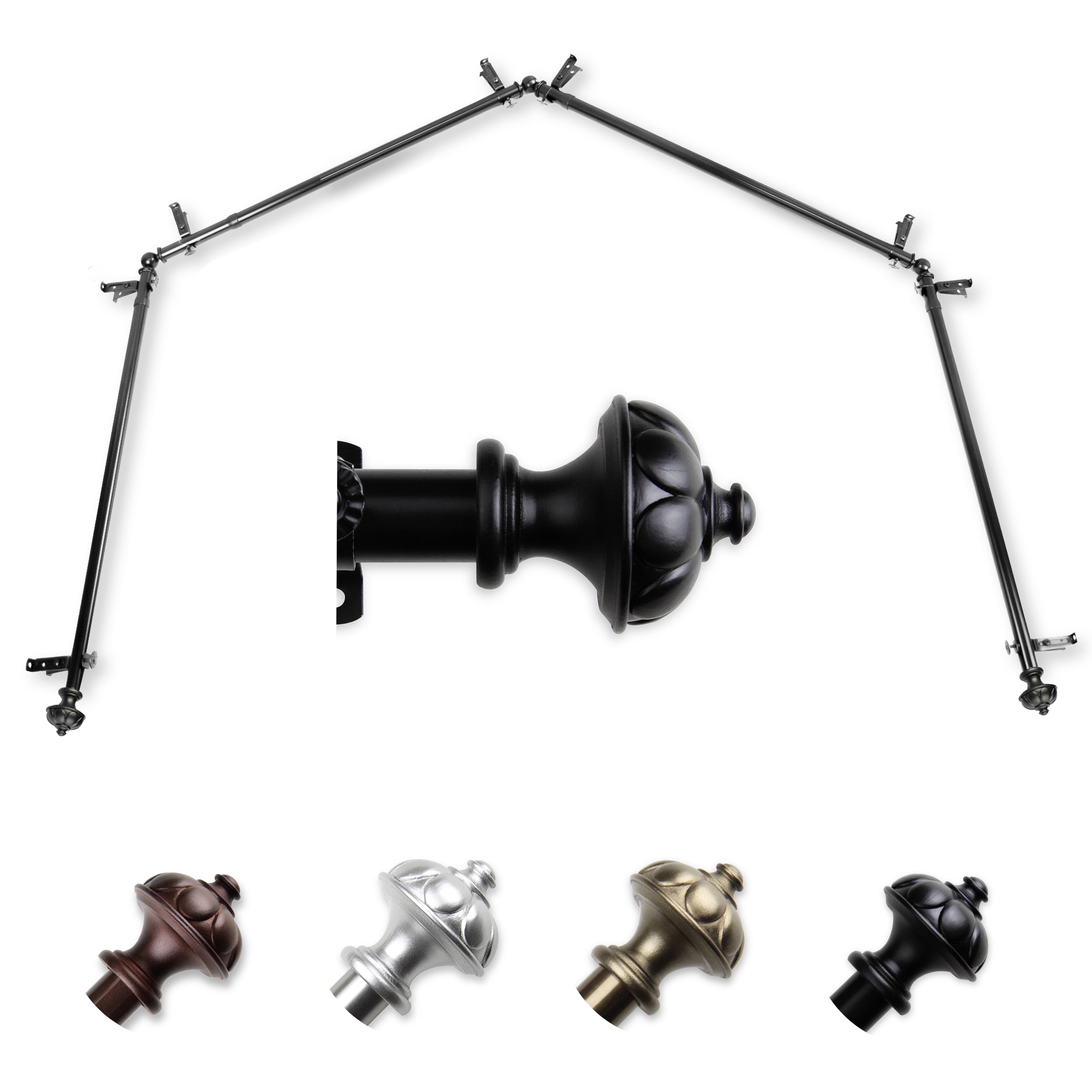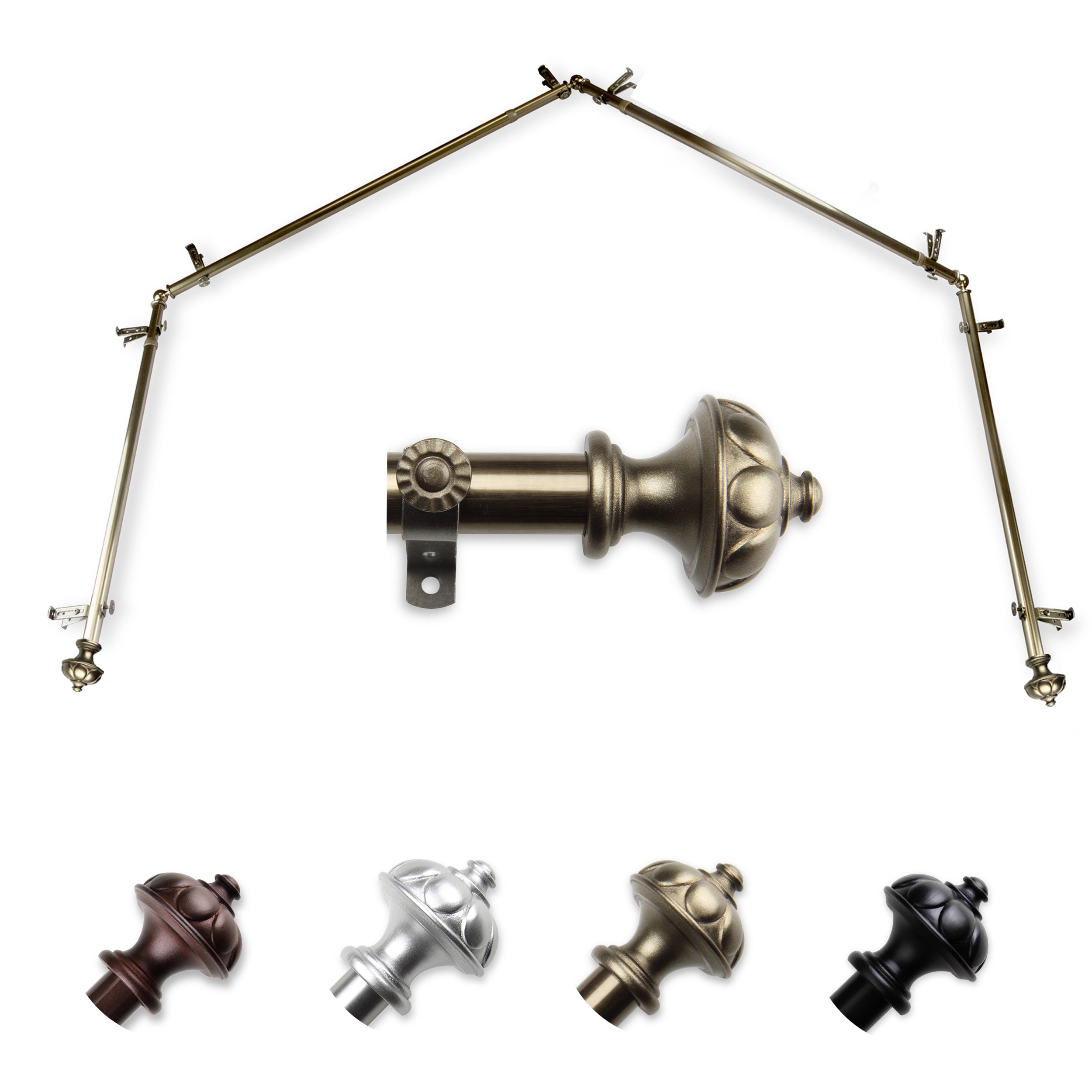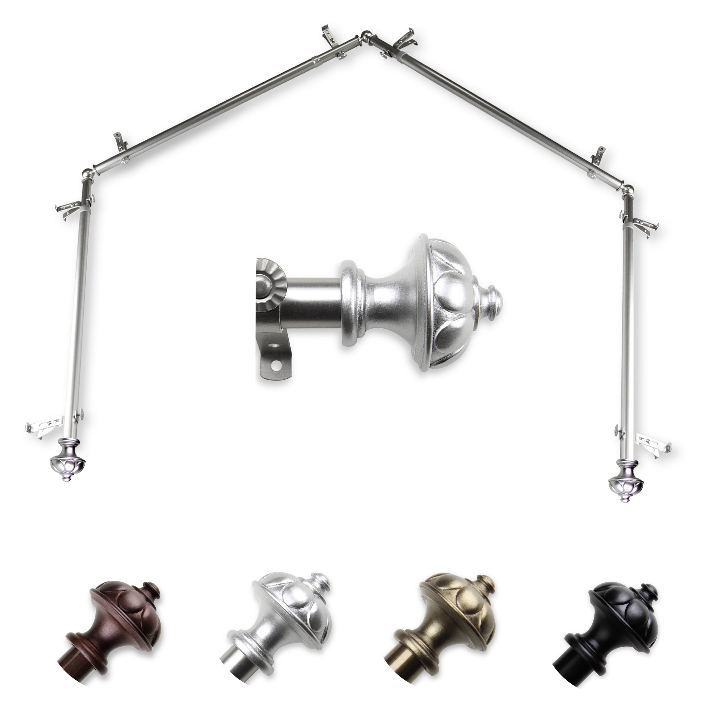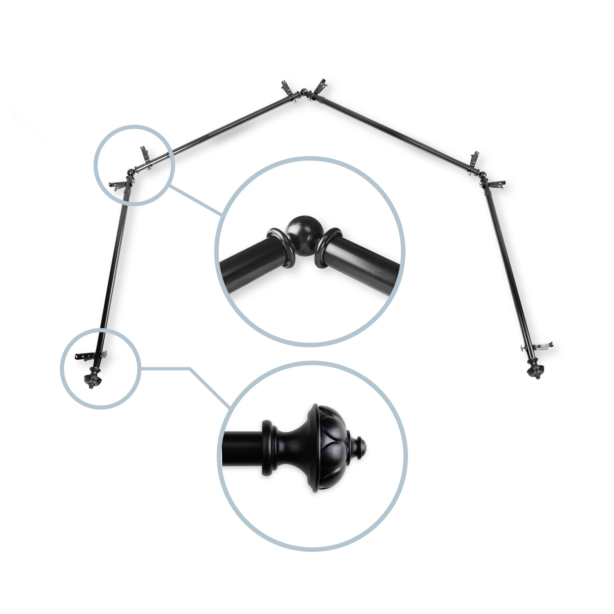Includes four 13/16" diameter adjustable poles, one pair of decorative finials, 8 single brackets, 3 corner connectors, and mounting hardware