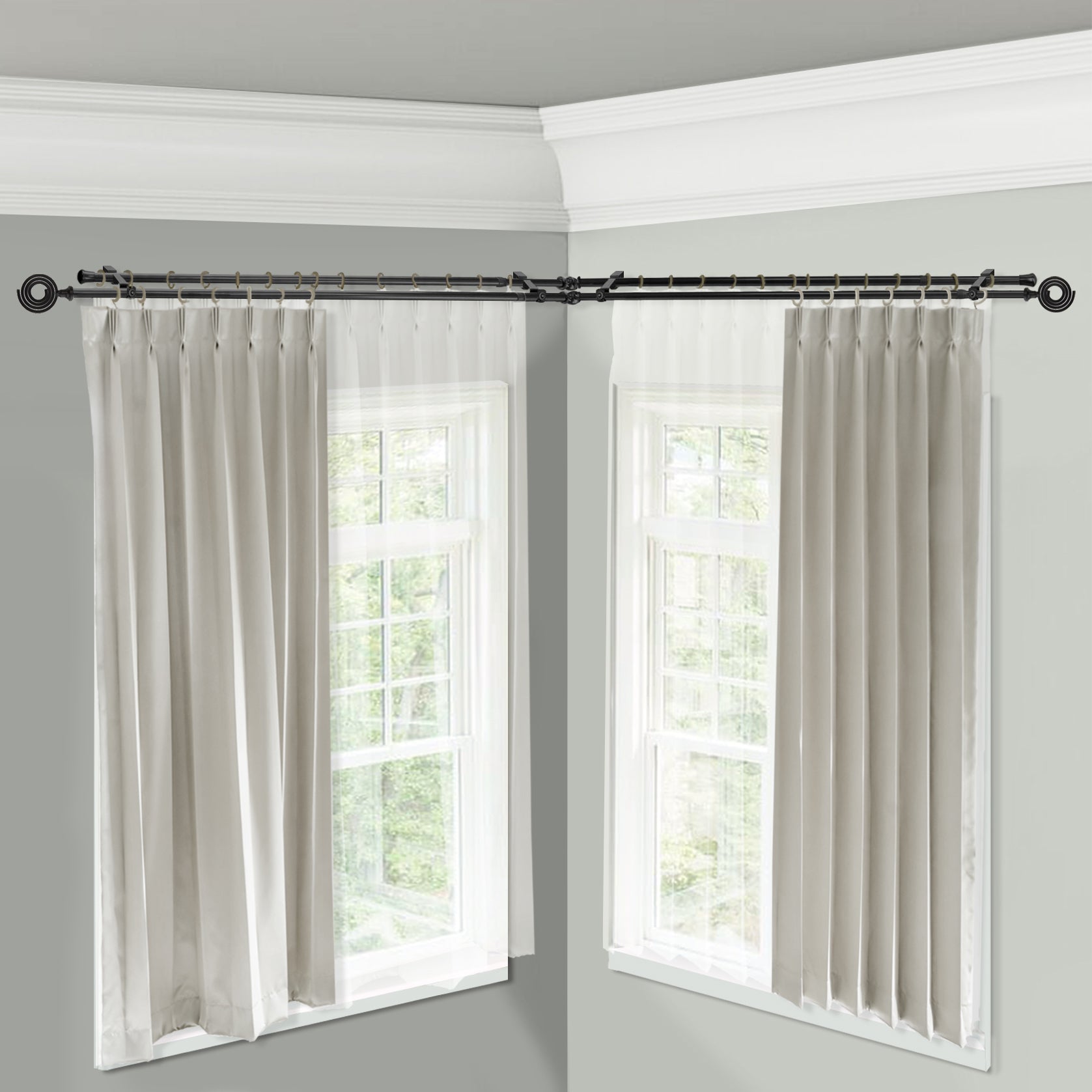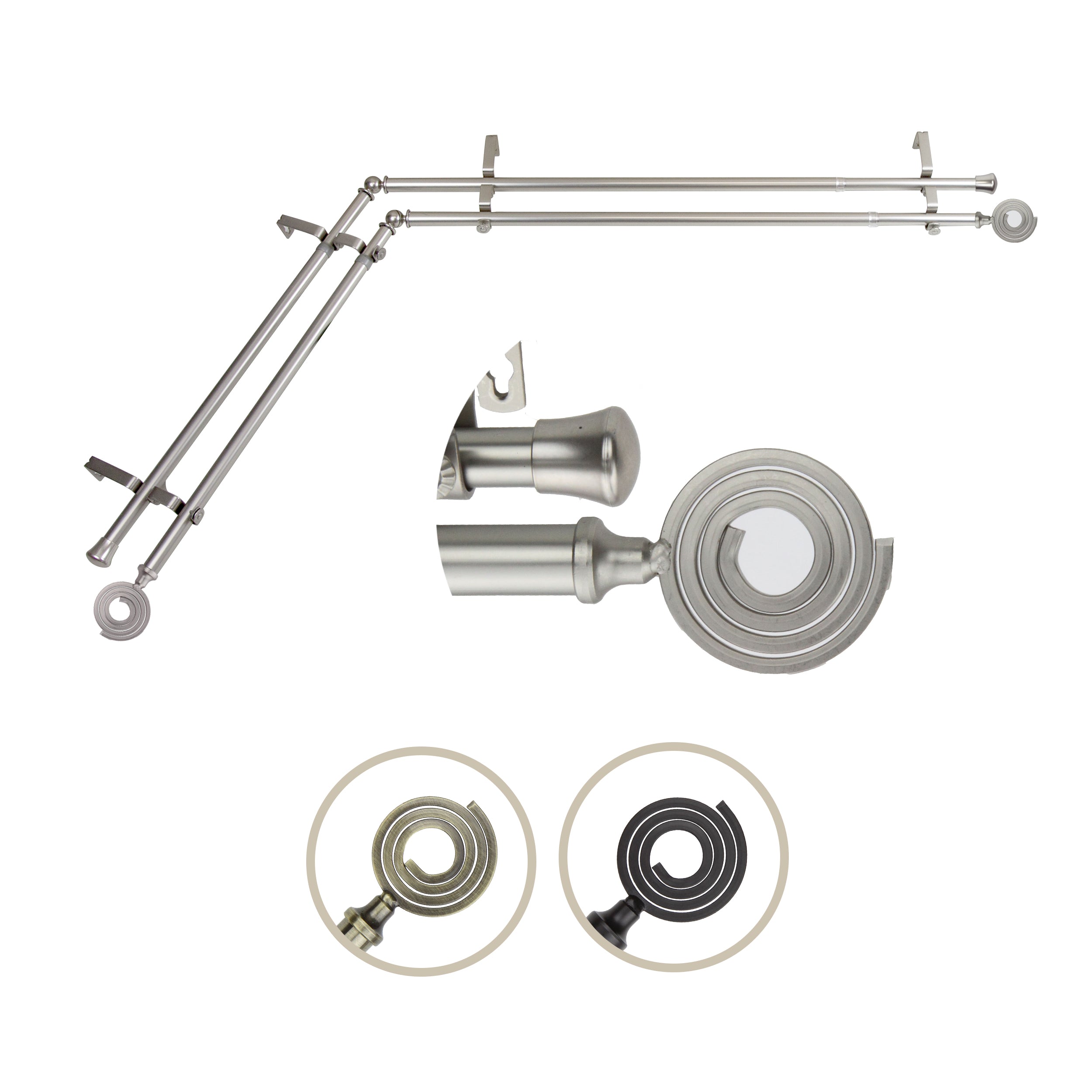 Includes four 13/16" diameter adjustable poles, one pair of decorative finials, one pair of end caps, two corner connectors, brackets, and mounting hardware